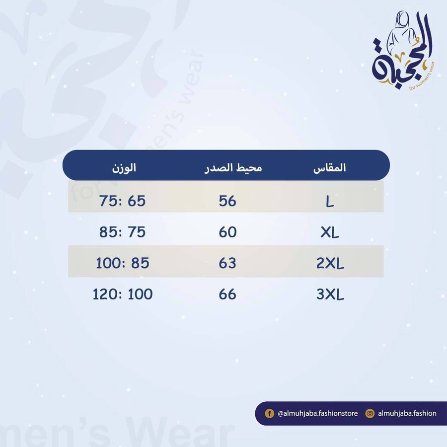 لضمان المقاس المناسب للعباية يرجى اختيار المقاس بناء على جدول المقاسات الموجود ضمن الصور