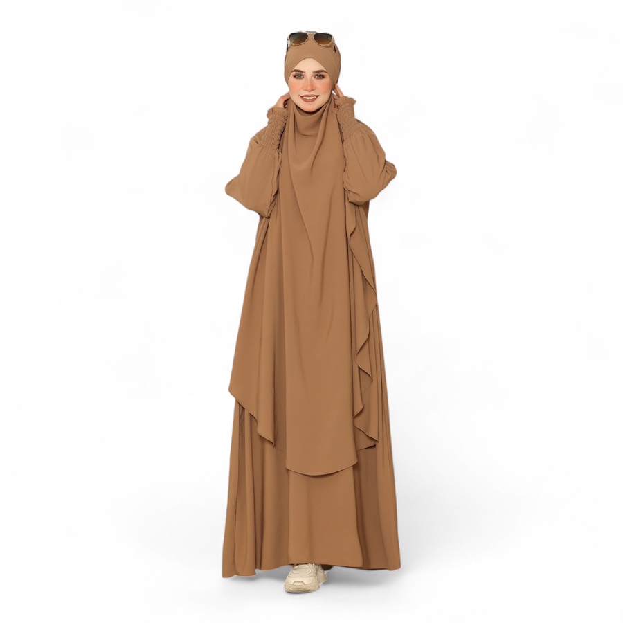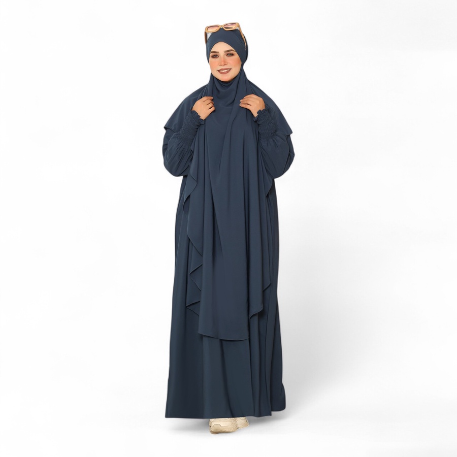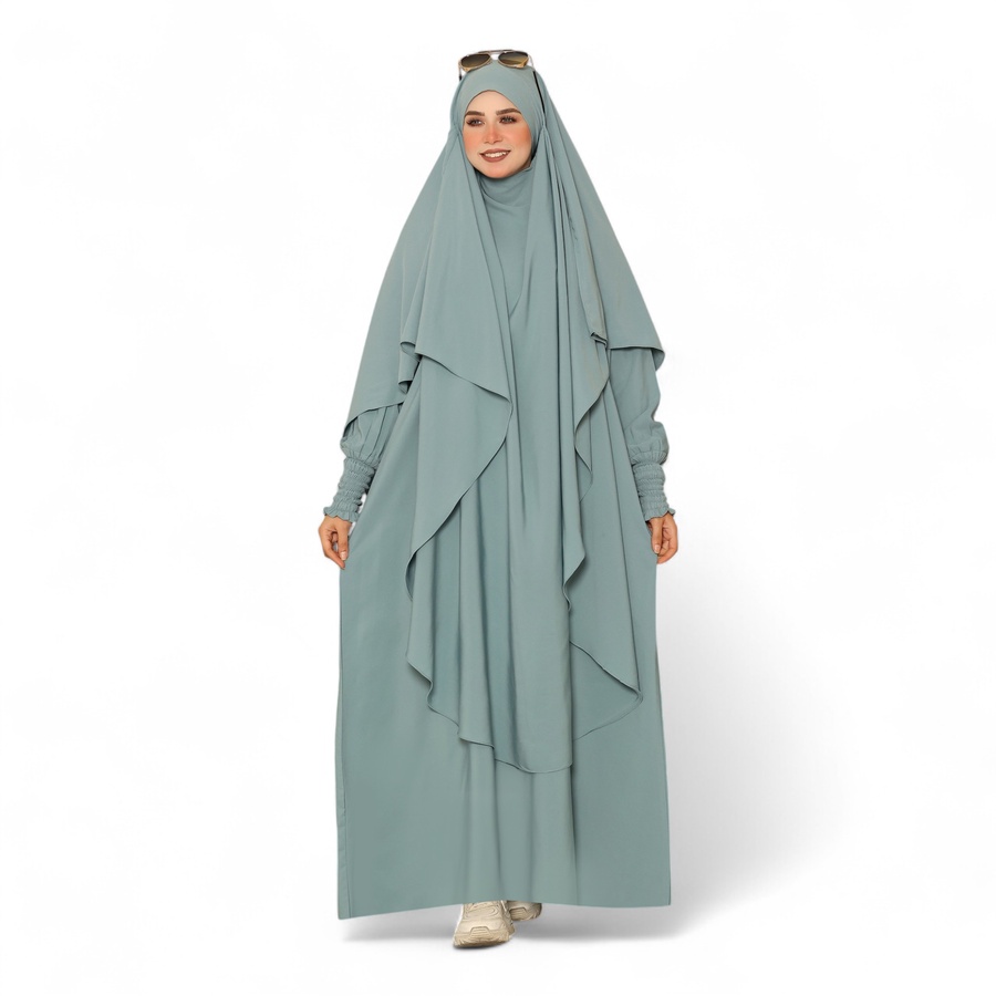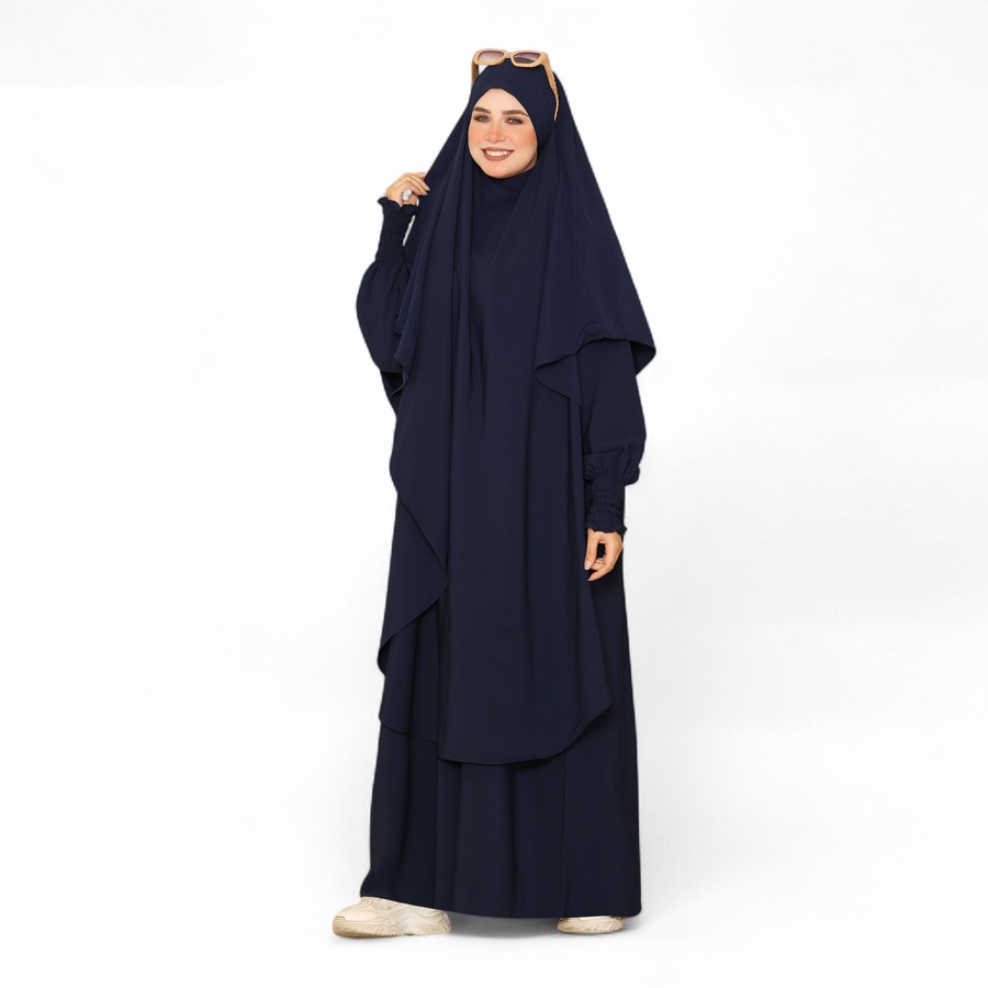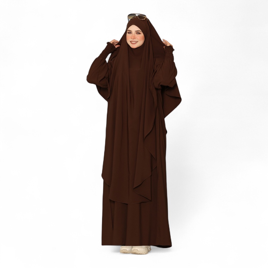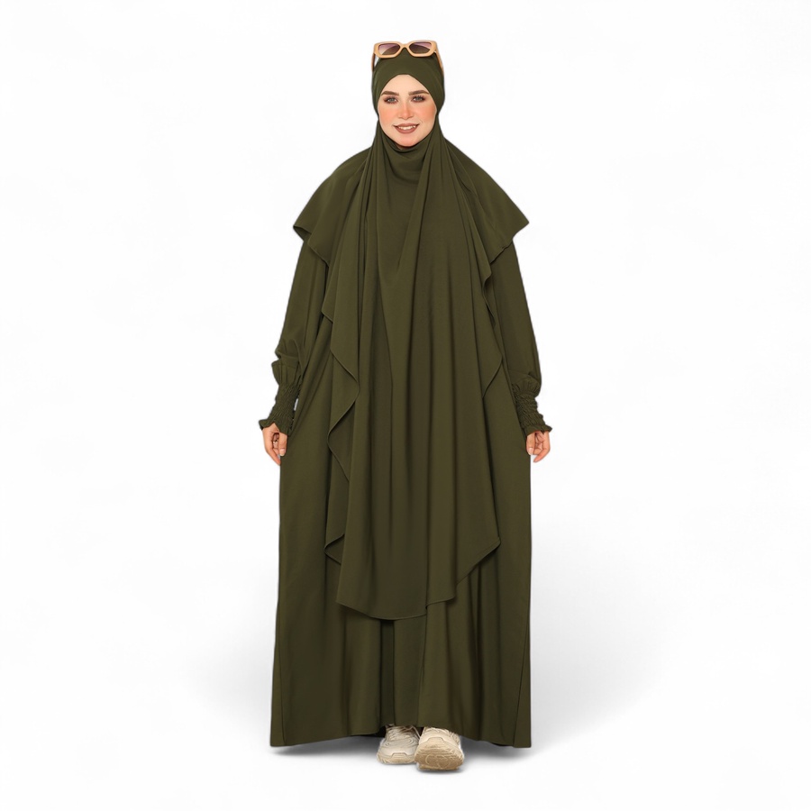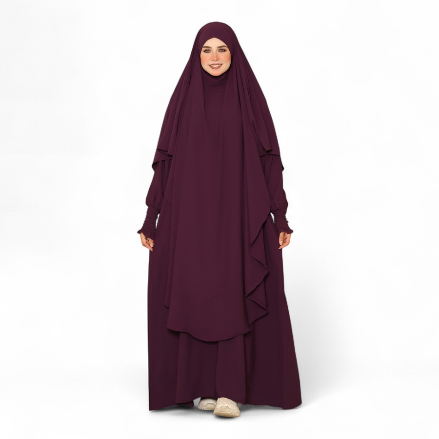 - التصميم: طقم قطعتين (عباية + خمار كبير) يغطي بكل أناقة.