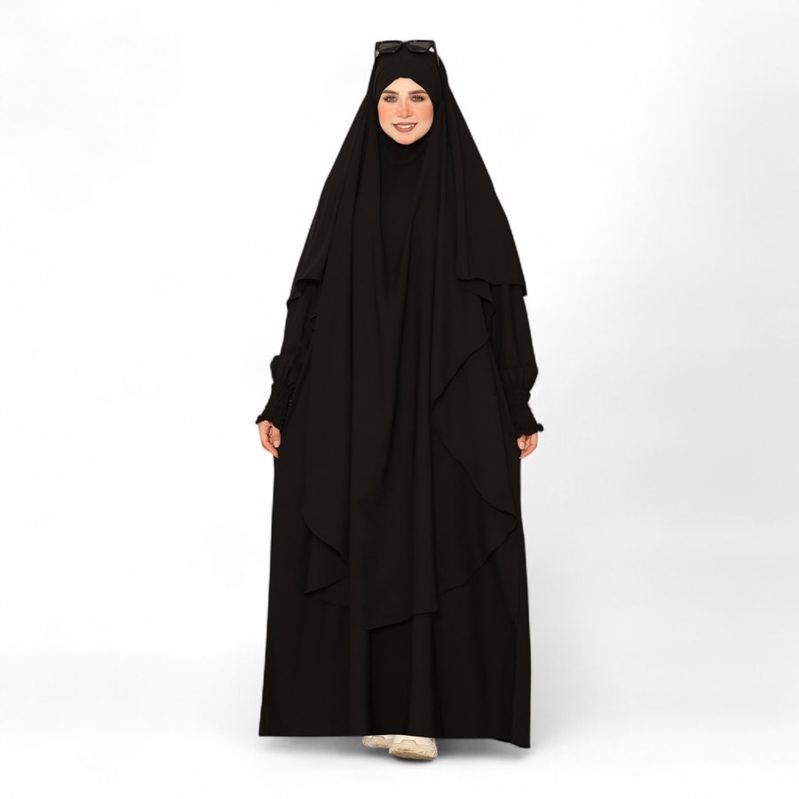 إطلالة مثالية تجمع بين الحشمة والراحة مع عباية بخمار مكونة من قطعتين: خمار كبير يغطي بالكامل وعباية أنيقة بقصة مريحة، مصنوعة من خامة الكريب التركي الفاخر.