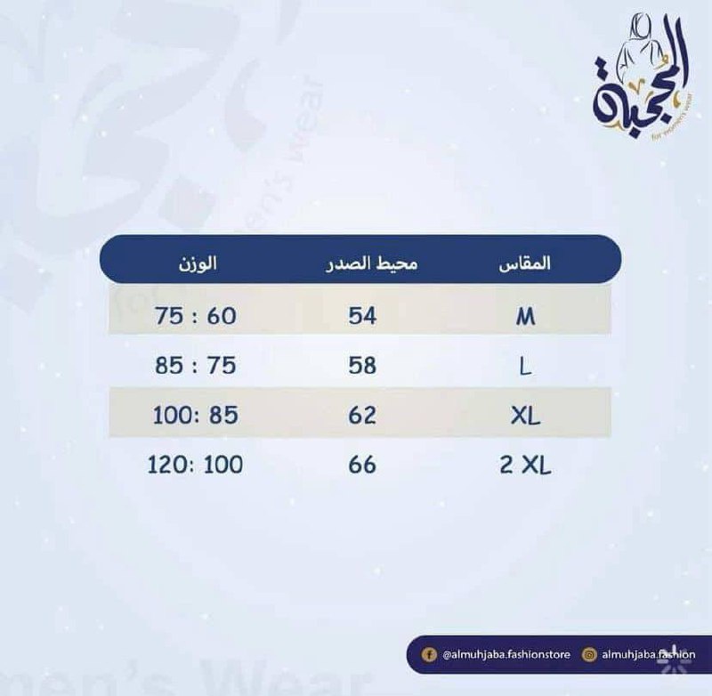 لضمان المقاس المناسب يرجى اختيار المقاس بناء على جدول المقاسات الموجود ضمن الصور